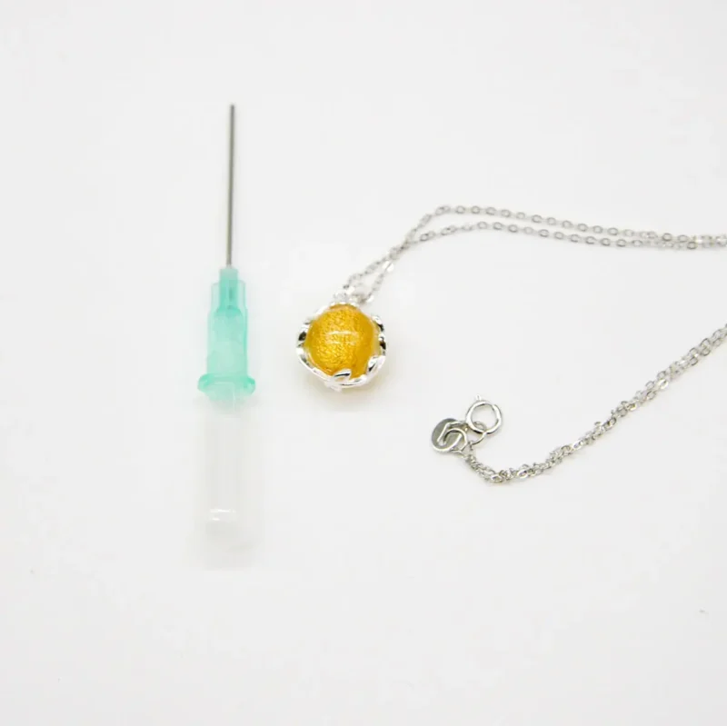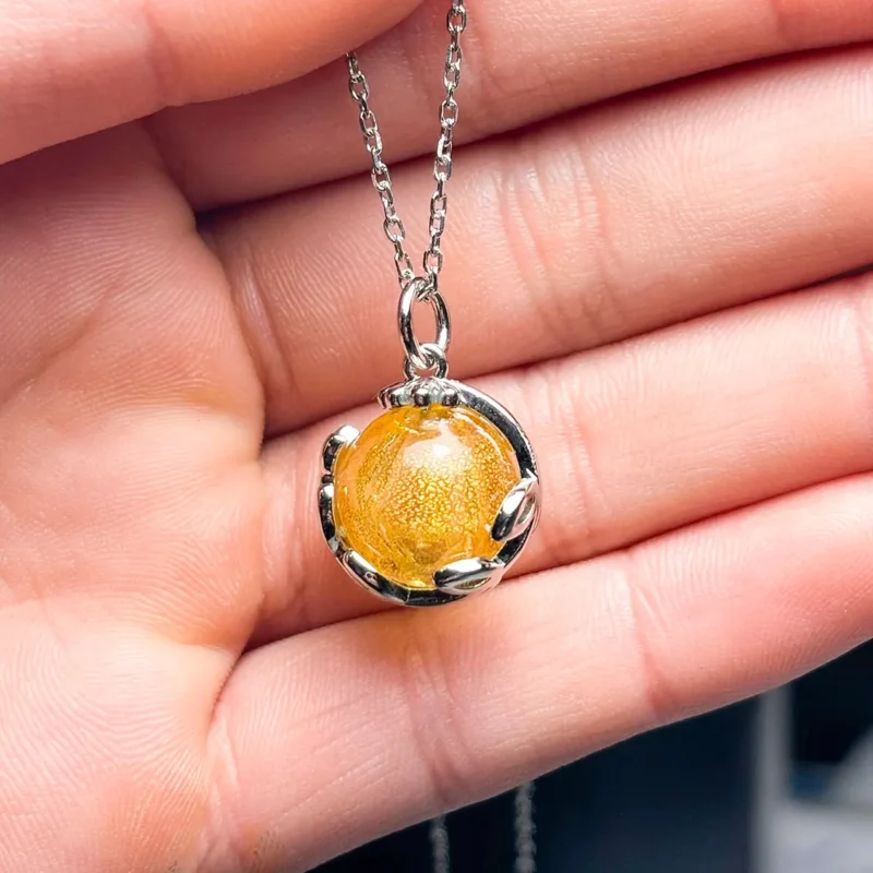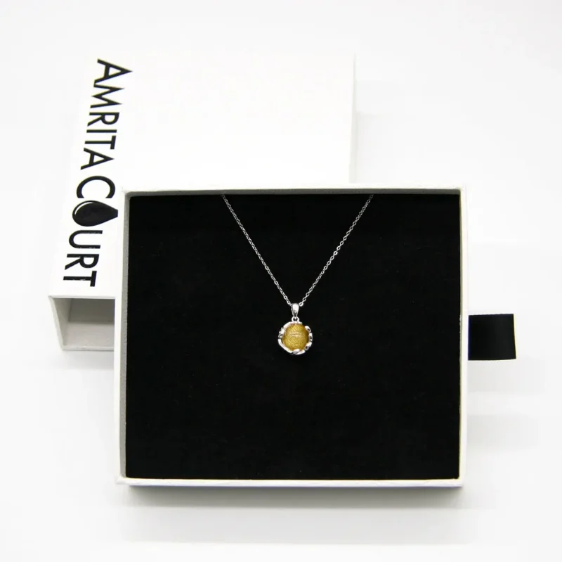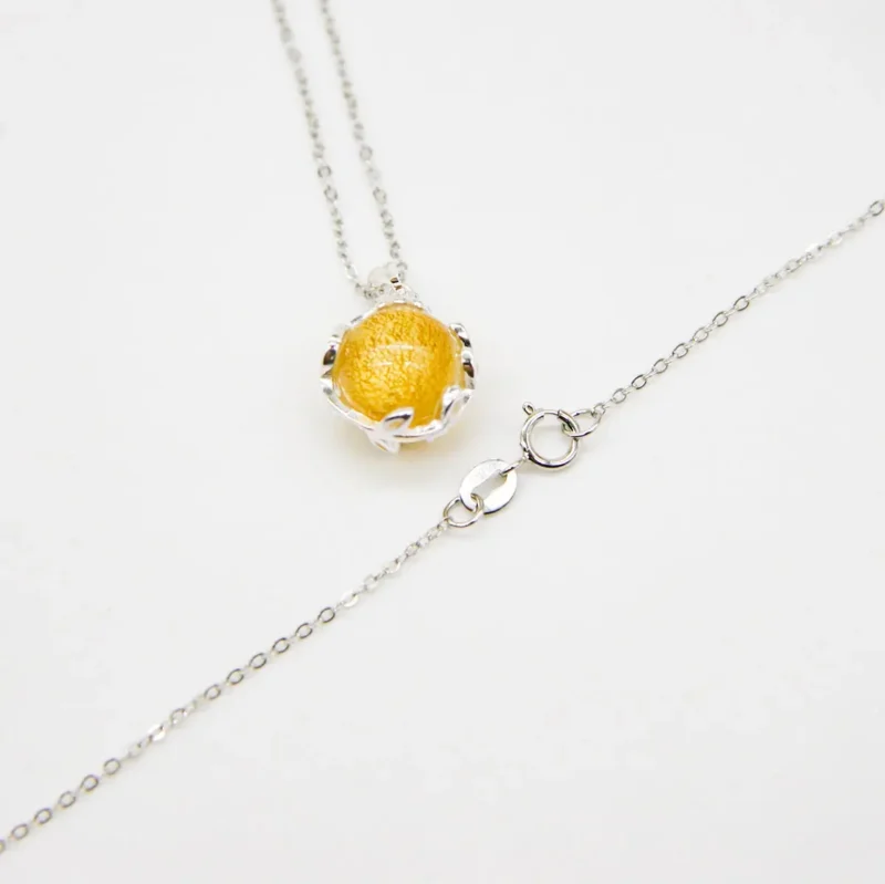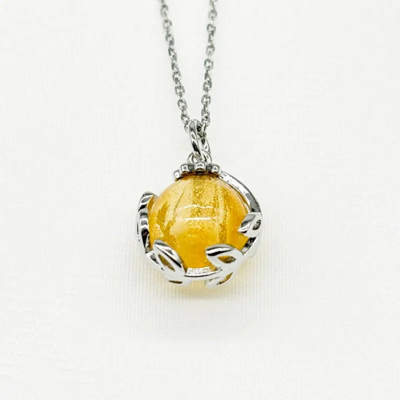 The Jovian Gold Aroma Necklace elevates your style with a stunning golden yellow glow. Specifically, this beautiful piece offers a harmonious blend of exquisite design and timeless aromatherapy. We crafted the pendant and chain with 18k white gold plating to ensure a brilliant finish. Moreover, every Murano glass piece is meticulously hand-blown. Because each globe features delicate gold flakes, this celestial jewelry resembles a beautiful planet beyond imagination.