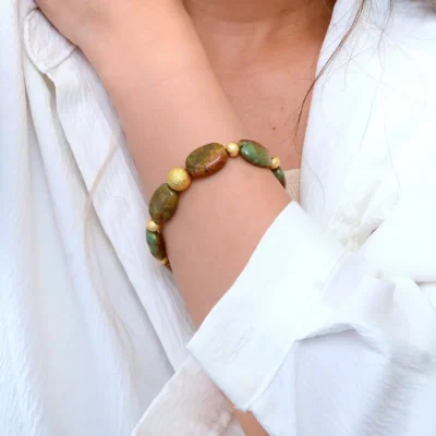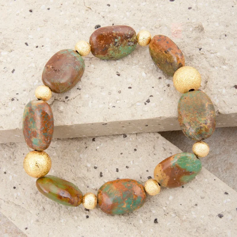 Elevate your style with the Patagonia Green Turquoise Bracelet, a masterpiece of artisanal jewelry. Handcrafted with genuine green turquoise nuggets and finished in elegant 18k gold-plated brass, this Patagonia Green Turquoise Bracelet offers the perfect balance of luxury and earthy charm. Each piece is unique, featuring a natural matrix that symbolizes balance, protection, and a deep connection to nature.